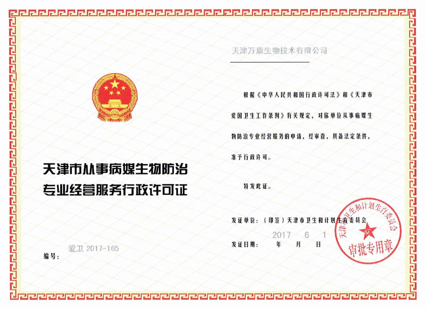 天津萬康生物技術有限公司是經天津市行政中心認證、工商注冊的從事殺蟲滅鼠、衛生消毒、媒介監測及藥品批發零售的******PCO(有害生物防治)公司,自成立以來一直致力于生活環境、自然環境的改善、保護和管理,堅持技術創新走可持續發展道路。公司聘請多名專家和資深顧問,為客戶提供******的解決方案,同時得到了中國農業大學、中國農業科學研究院、天津出入境檢驗檢疫局、西南大學、天津農學院等相關專家教授的大力支持和指導。我們堅持“誠實、守信、安全、環?!钡姆兆谥迹闷餍稻鶠槭澜鐑炠|產品,所用藥物均系國家藥檢部門和衛生防疫部門批準的安全、低毒的城市衛生用藥,并根據具體作業環境和防治對象情況變化,制定具體防制方案,保證******的防治效果和人體安全。目前,已為賓館、飯店、企業、醫院、機關、學校、博物館、娛樂場所、寫字樓、倉庫、住宅小區、家庭等場所提供了優質的有害生物防治服務,已得到了社會各界的普遍接受和認可。服務的理念:“以人為本,誠信服務,合理收費,拒絕暴利”。服務的目標:“客戶的滿意是我們永遠追求的目標”!服務的使命:“平衡生態,綠色環保”